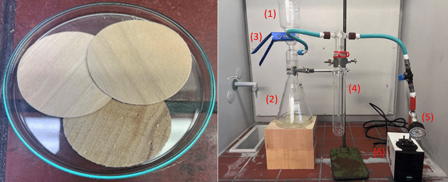 Figure 2: Left: Wood filtration disks (50 mm diameter and 1 mm thickness). Right: Setup for the filtration experiments: graduated funnel (1), filter flask (2), aluminium clamp (3), water trap (4), pressure gauge (5), and vacuum membrane pump (6).