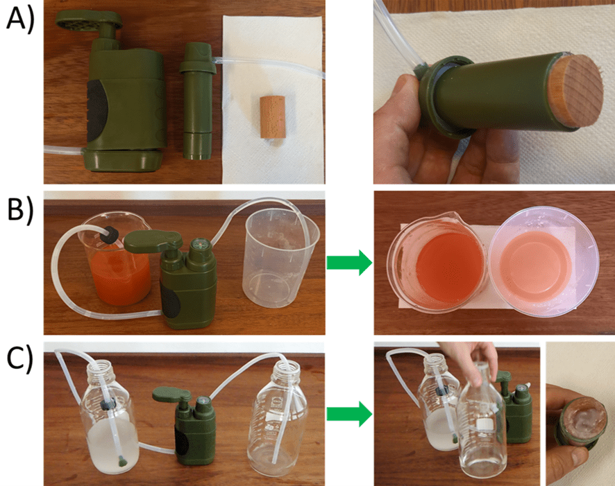 Figure 3: Details of a manual water filtration system using a beech cylinder of 4.5 cm in length and 2.5 cm in diameter. A) Filtration system and beech filter. B) Filtration of 0.01% iron oxide nanoparticles. C) Filtration of 0.1% silica microparticles.